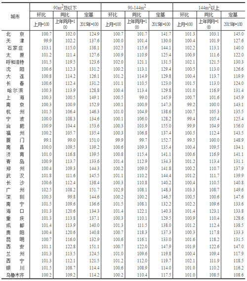 在12月份70個(gè)大中城市新建商品住宅銷(xiāo)售價(jià)格分類(lèi)指數(shù)變動(dòng)情況中,在90㎡以下的面積區(qū)間中,石家莊的新建商品住宅銷(xiāo)售價(jià)格環(huán)比上漲了3.1%,位列70城第一,西安的新建商品住宅銷(xiāo)售價(jià)格同比上漲了20.8%,位列70城第一;在90-144㎡的面積區(qū)間中,廣州的新建商品住宅銷(xiāo)售價(jià)格環(huán)比上漲了2.9%,位列70城第一,海口的新建商品住宅銷(xiāo)售價(jià)格同比上漲了22.1%,位列70城第一;在144㎡以上的面積區(qū)間中,廣州的新建商品住宅銷(xiāo)售價(jià)格環(huán)比上漲了3.3%,位列70城第一,海口的新建商品住宅銷(xiāo)售價(jià)格同比上漲了23.1%,位列70城第一。