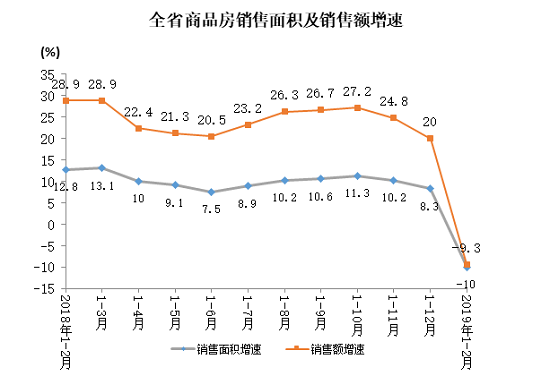 1-2月,全省商品房銷售面積669.68萬平方米,同比下降10.0%。其中,住宅銷售面積下降8.3%,辦公樓銷售面積下降74.5%,商業營業用房銷售面積下降24.1%。商品房銷售額386.33億元,下降9.3%。其中,住宅銷售額下降4.5%,辦公樓銷售額下降64.2%,商業營業用房銷售額下降28.2%。