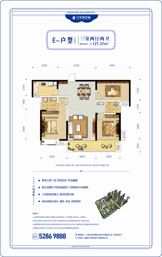 戶型賞析:朗闊的四房設計,南北通透,動靜分區,干濕分離,生活更加從容。客餐廳一體化設計,賦予生活豐盛內涵。臥室分離,保證家庭成員的隱私,給予每個家人充分的個人空間。4.0米超大開間客廳和景觀陽臺,與不遠處的九華湖德文化公園遙相呼應,在家便能將遠處美景收入眼中。雙衛設計,避免更多尷尬窘迫時刻。