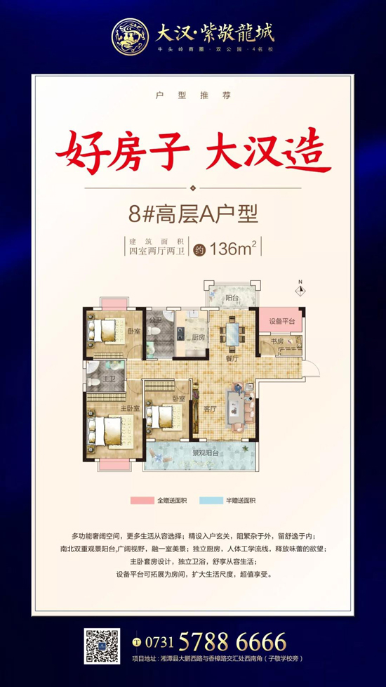 戶型賞析:奢闊五房設計,超14㎡帶獨衛的南向次臥,方便居者日常起居。全明空間通透格局,充分體現居者居家情調。 7.7米超闊觀景陽臺,社區周邊大美風光一覽無余。雙廚房設計,不論是私宴還是家宴,好廚藝皆可盡情發揮。雙臥室朝南格局,采光效果更佳優越。