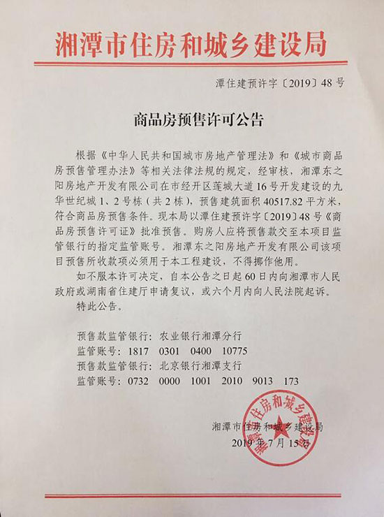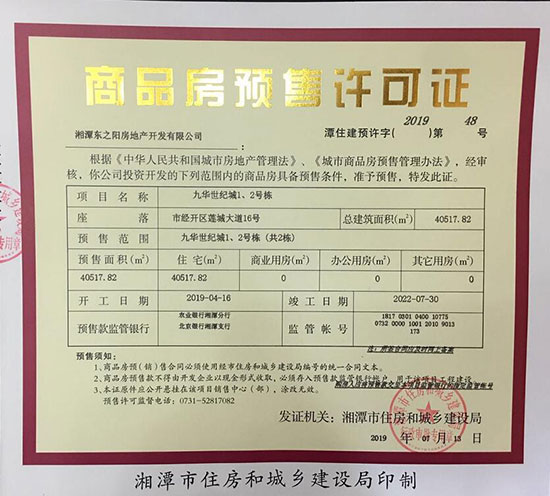 經(jīng)審核,湘潭東之陽房地產(chǎn)開發(fā)有限公司在市經(jīng)開區(qū)蓮城大道16號開發(fā)建設(shè)的九華世紀(jì)城1、2號棟(共2棟),預(yù)售建筑面積40517.82平方米,符合商品房預(yù)售條件,現(xiàn)本局以潭住建預(yù)許字[2019]第48號《商品房預(yù)售許可證》批準(zhǔn)預(yù)售。