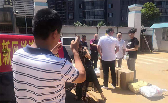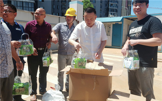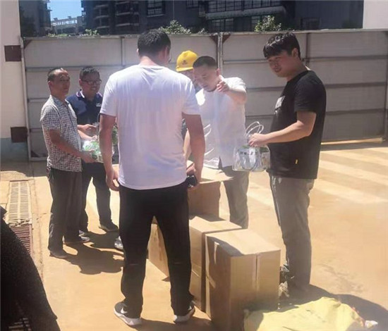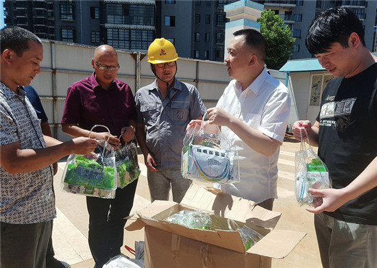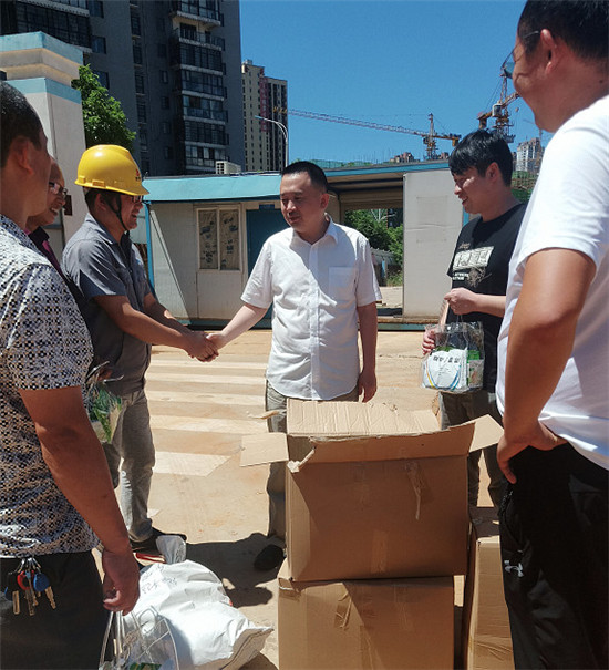 在工程項目施工人員正頂著烈日作業,高新區總工會主席李奇帶著滿滿的心意走上前與他們握手,為他們發放了高溫慰問品,并對在崗的員工們連聲說著“你們辛苦了!