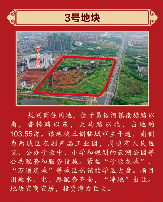 該地塊易俗河鎮南塘路以南、香樟路以東、天馬路以北,三側臨城市主干道,南側為西城區農副產品工業園,周邊有人民醫院、公辦子敬中、小學和規劃的云湖公園等公共配套和服務設施。緊臨“紫敬龍城”、“萬通逸城”等城區熱銷的學區大盤。