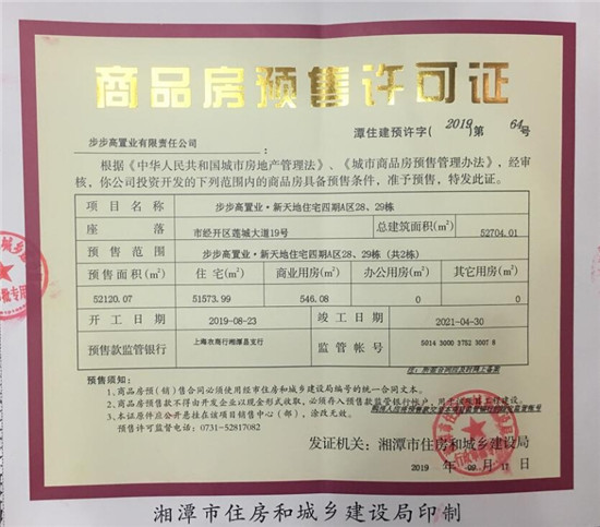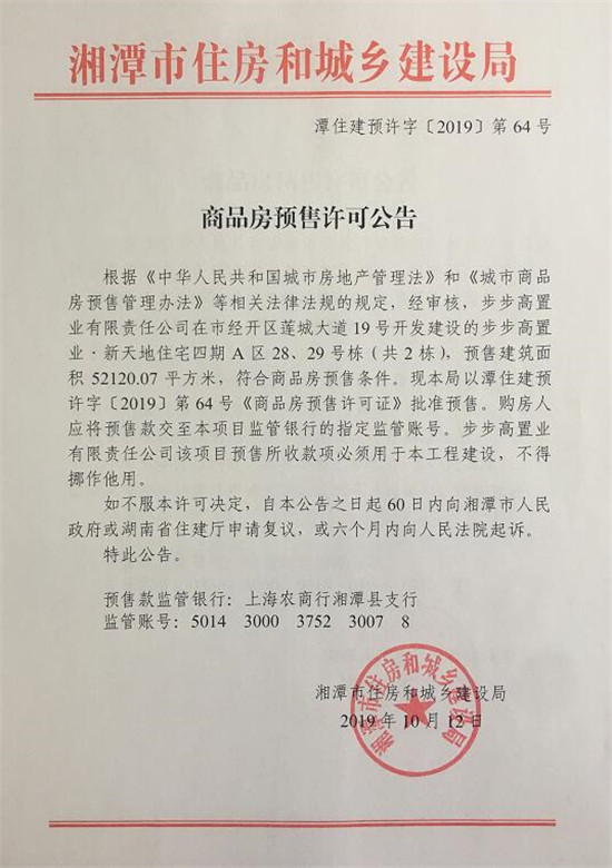 經審核,步步高置業有限責任公司在市經開區蓮城大道19號開發建設的步步高置業·新天地住宅四期A區28,19號棟(共2棟),預售建筑面積52120.07平方米,符合商品房預售條件,現本局以潭住建預許字【2019】第64號《商品房預售許可證》批準預售。