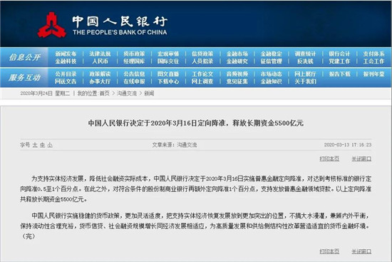 3月16日,中國人民銀行實施普惠金融定向降準,對達到考核標準的銀行定向降準0.5至1個百分點。在此之外,對符合條件的股份制商業銀行再額外定向降準1個百分點,支持發放普惠金融領域貸款。以上定向降準共釋放長期資金5500億元。