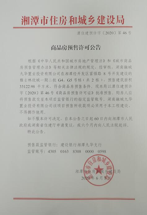 經審核,晨輝建工集團房地產開發有限公司在市雨湖區昭潭街道南嶺路開發建設的白石古蓮城松竹里6、7、8、9號棟(共4棟),預售建筑面積53384.7平方米,符合商品房預售條件,現本局以潭住建預許字【2020】47號《商品房預售許可證》批準預售。 |