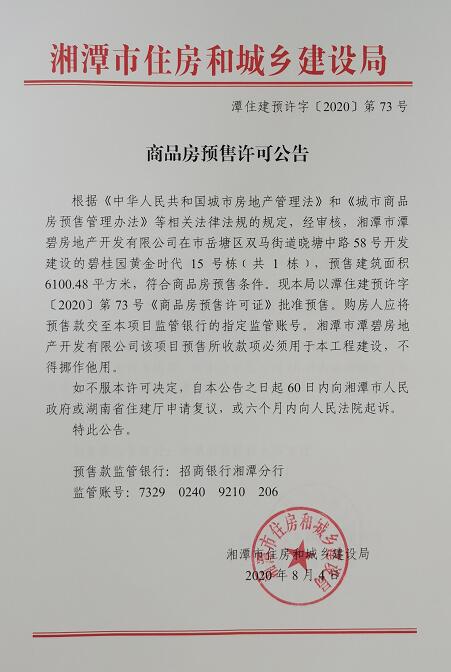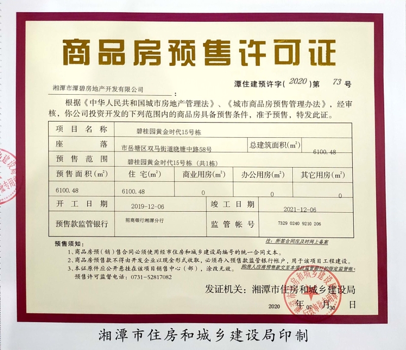 關于碧桂園黃金時代15號棟(共1棟)預售許可公告