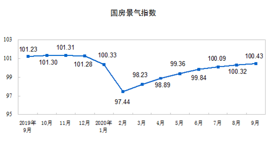 9月份,房地產(chǎn)開(kāi)發(fā)景氣指數(shù)(簡(jiǎn)稱(chēng)“國(guó)房景氣指數(shù)”)為100.43,比8月份提高0.11點(diǎn)。