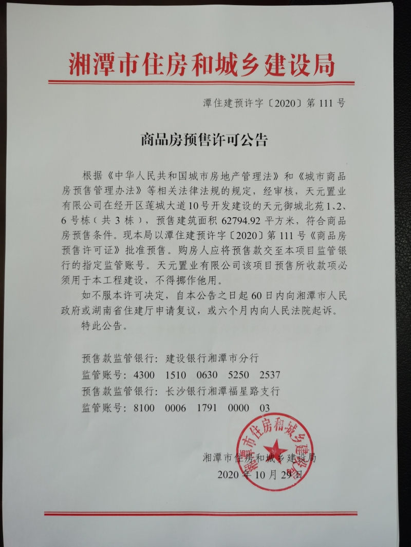 關于天元御城北苑1、2、6號棟(共3棟)預售許可公告