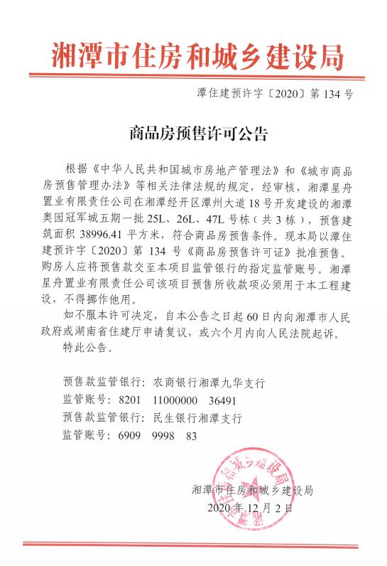 關(guān)于湘潭奧園冠軍城五期一批52L、26L、47L號(hào)棟(共3棟)預(yù)售許可公告