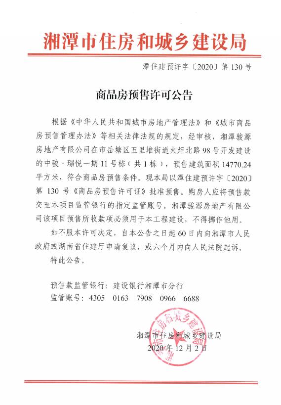 關于中駿·璟悅一期11號棟(共1棟)預售許可公告
