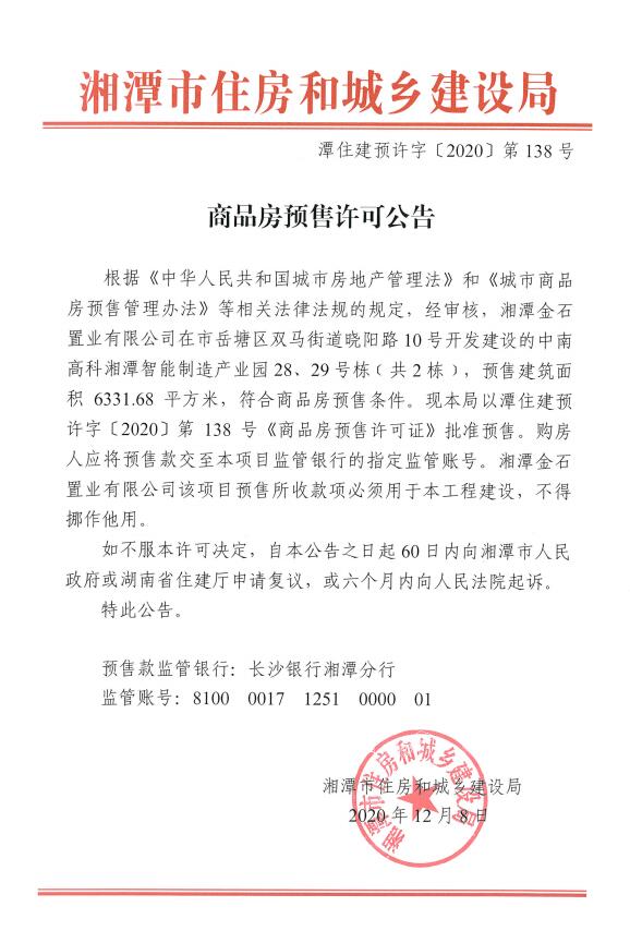關于中南高科湘潭智能制造產業園28、29號棟(共2棟)預售許可公告