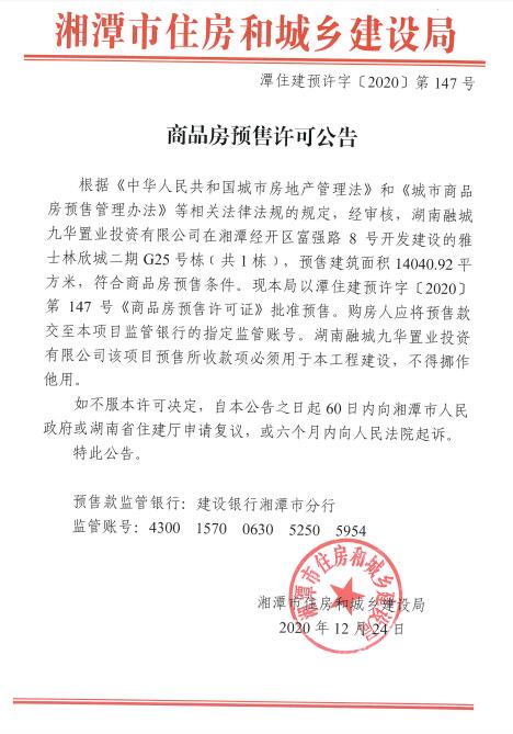 關(guān)于雅士林欣城二期G25號棟(共1棟)預(yù)售許可公告