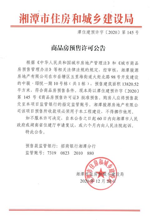 關于中駿·璟悅一期10號棟(共1棟)預售許可公告