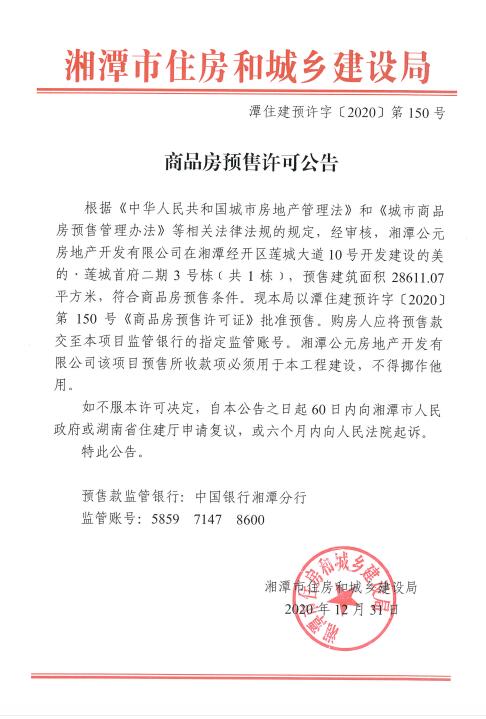 關于美的·蓮城首府二期3號棟(共1棟)預售許可公告