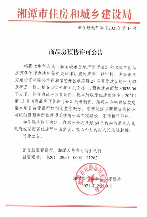 關于恒大御景半島二期二批61、62號棟(共2棟)預售許可公告