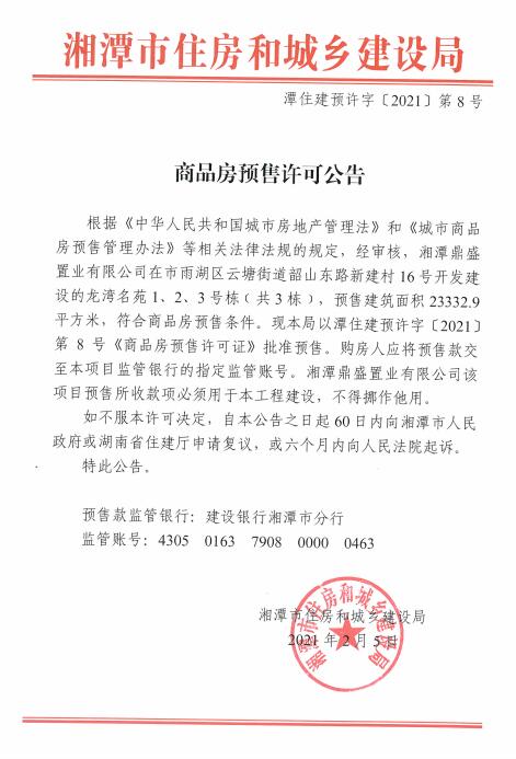 關于龍灣名苑1、2、3號棟(共3棟)預售許可公告