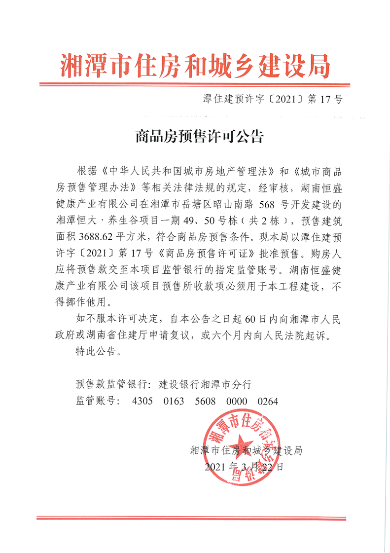 關于恒大養生谷項目一期49、50號棟(共2棟)預售許可公告