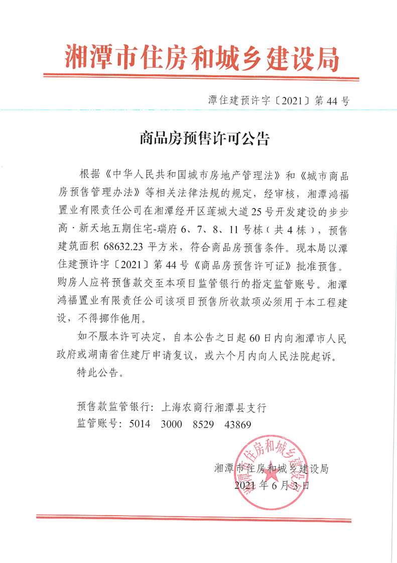 關于步步高·新天地五期住宅-瑞府6、7、8、11號棟(共4棟)預售許可公告