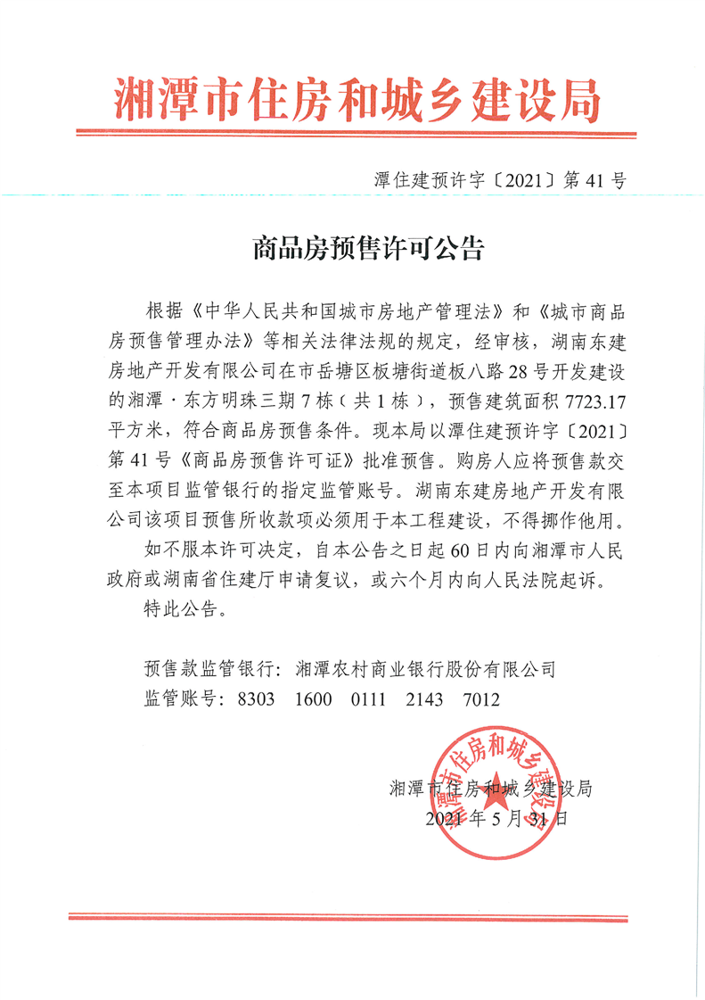 關于湘潭·東方明珠三期7棟(共1棟)預售許可公告