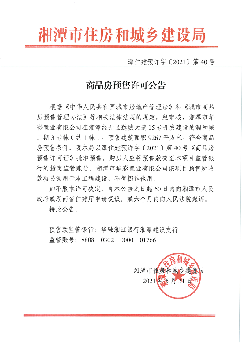 關于潤和城二期3號棟(共1棟)預售許可公告
