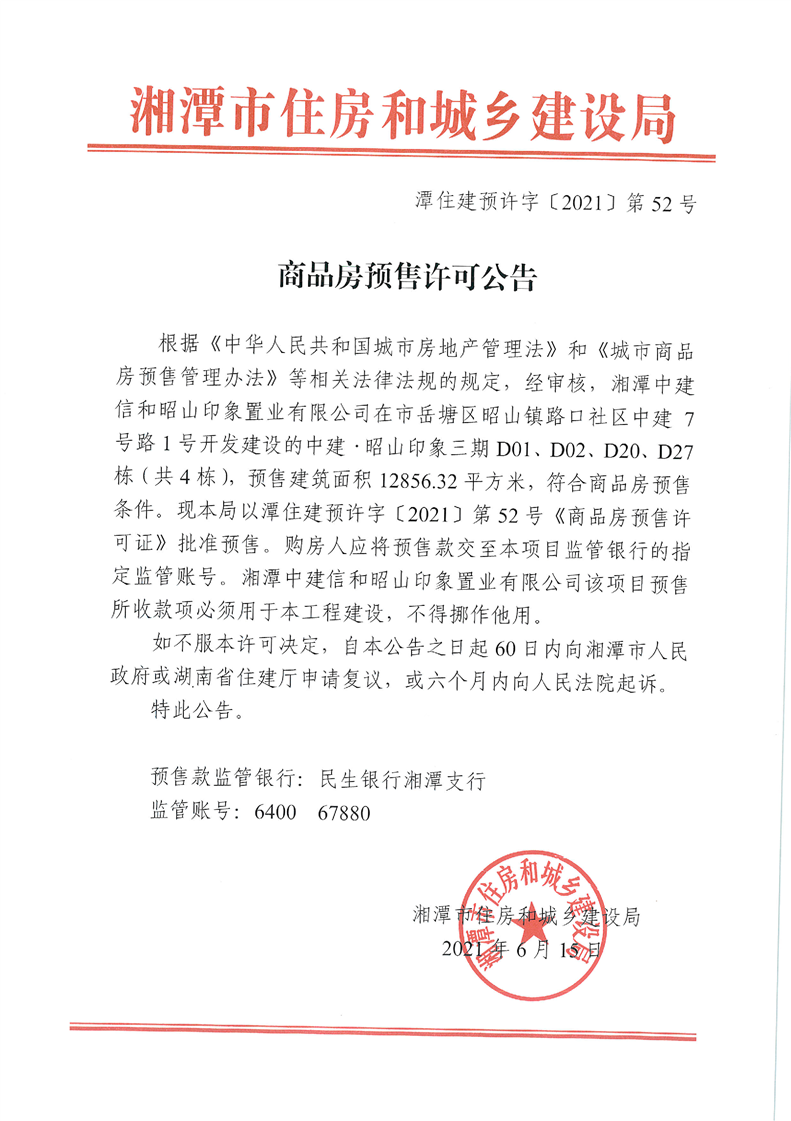 關(guān)于中建昭山印象三期D01、D02、D20、D27棟(共4棟)預(yù)售許可公告