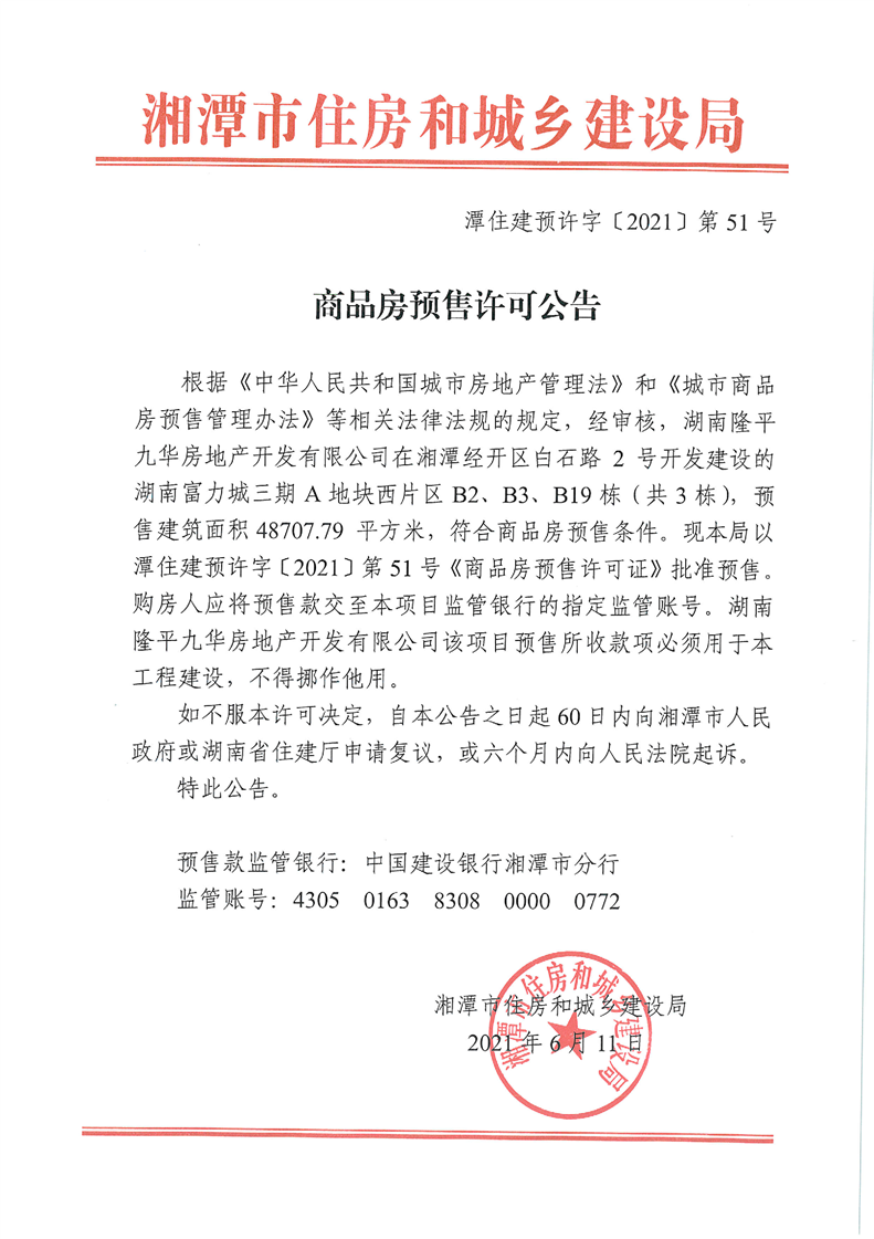 關(guān)于湖南富力城三期A地塊西片區(qū)B2、B3、B19號(hào)棟(共3棟)預(yù)售許可公告