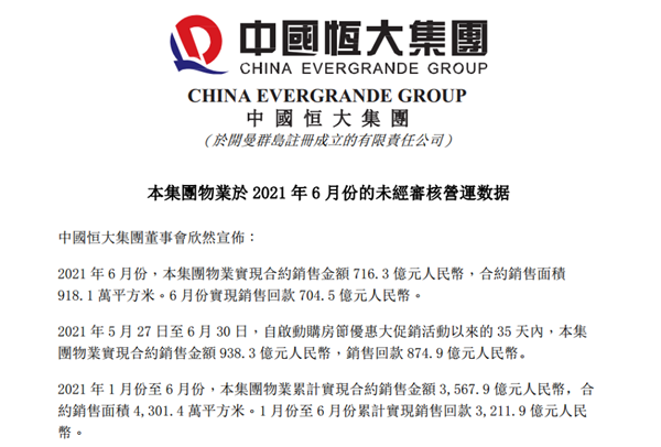7月1日,中國恒大發布公告,自啟動購房節優惠大促銷活動以來,從5月27日至6月30日35天內,恒大實現合約銷售938.3億元,銷售回款874.9億元,其中6月單月銷售716.3億元。