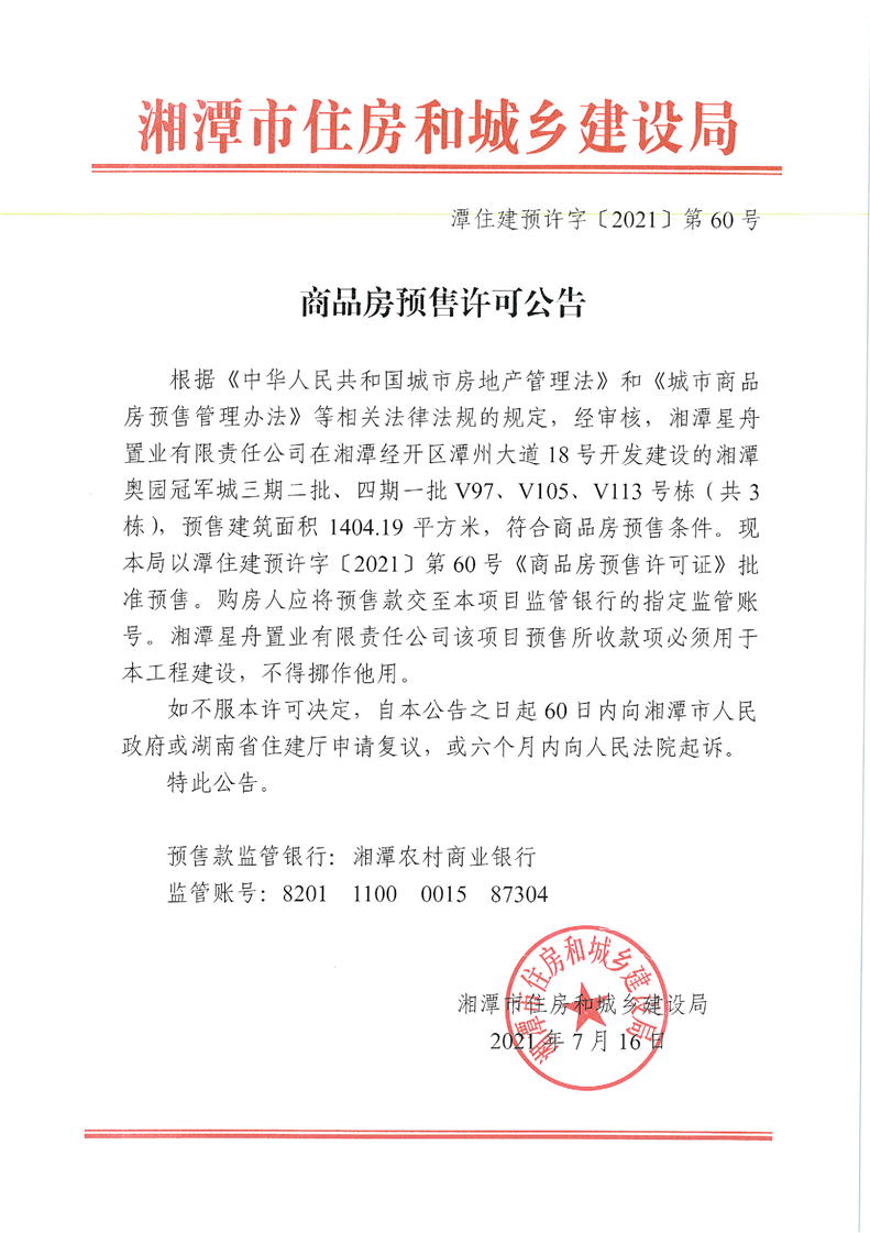 關(guān)于湘潭奧園冠軍城三期二批、四期一批V97、V105、V113號棟(共3棟)預(yù)售許可公告