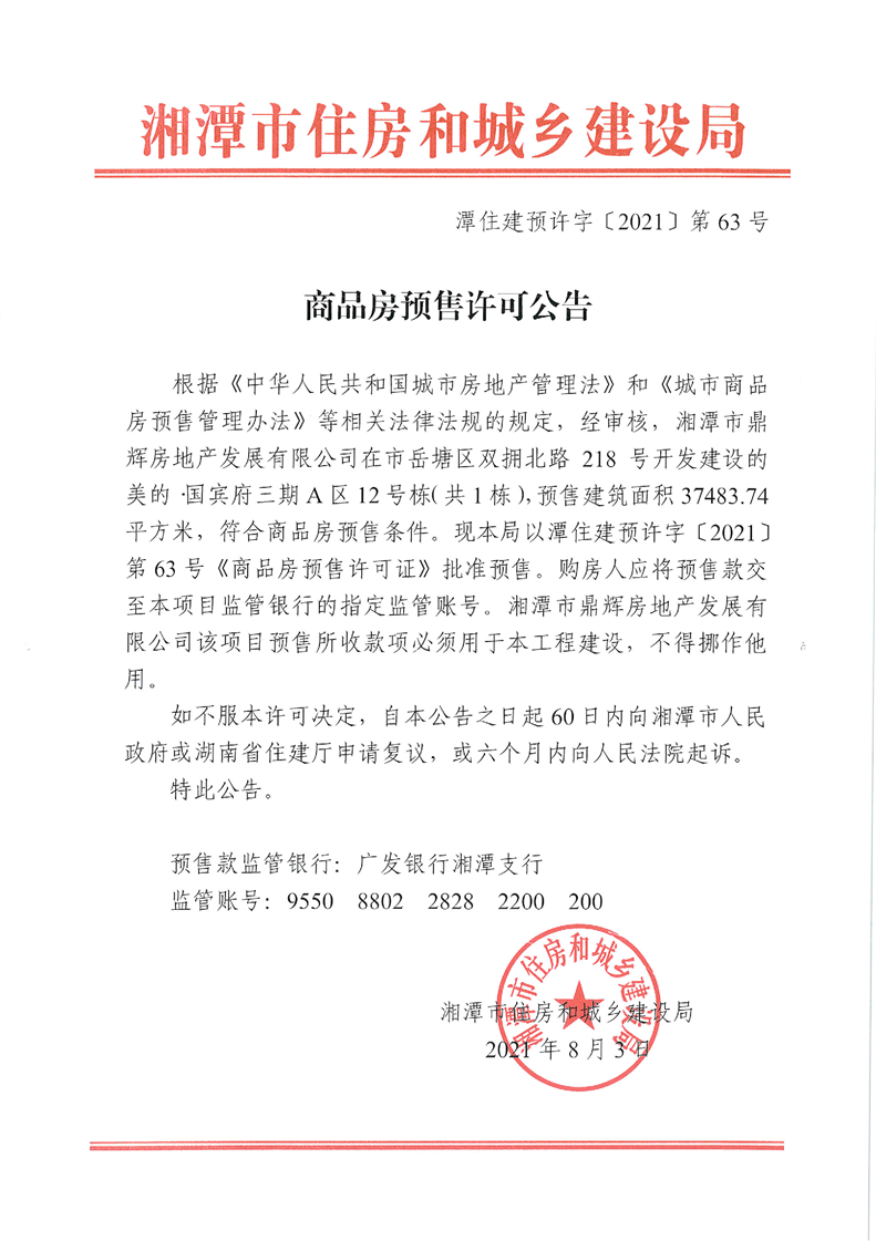 關于美的·國賓府三期A區12號棟(共1棟)預售許可公告