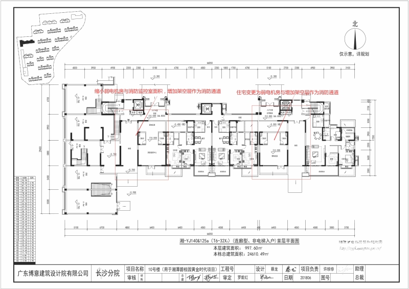 ②根據建筑設計消防規范第7.2.3條,建筑物與消防車登高操作場地對應的范圍內,應設置直通室外的樓梯或直通樓梯間的入口;湘潭碧桂園.黃金時代10#消防車登高操作場地位于10#的南側,因此施工圖按照規范調整了10#首層弱電機房的位置,減少了中間一套戶型,增加了與南側消防登高操作場地直通樓梯間的連通入口,詳見附圖。