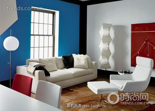 白色家具在客廳中所占面積較大,主人用幾把紅色餐椅和花瓶的裝飾與墻面色彩產(chǎn)生呼應(yīng)。