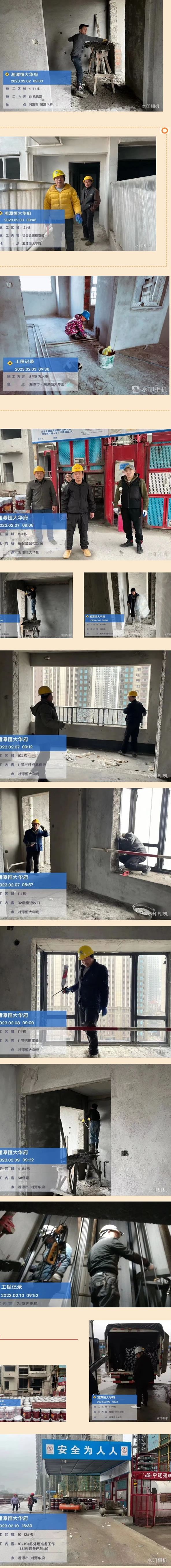 湘潭恒大華府工程進度:4-5#棟砌體抹灰完成,保溫及水電施工中,室內電梯準備排產。7-9#棟室內電梯安裝完成90%,鋁合金推拉門框已到場,精裝修預計三月份進場施工。11-12#棟鋁合金窗框已完成,外墻漆材料均已到場,施工吊籃已安裝完成,室內電梯正在排產。