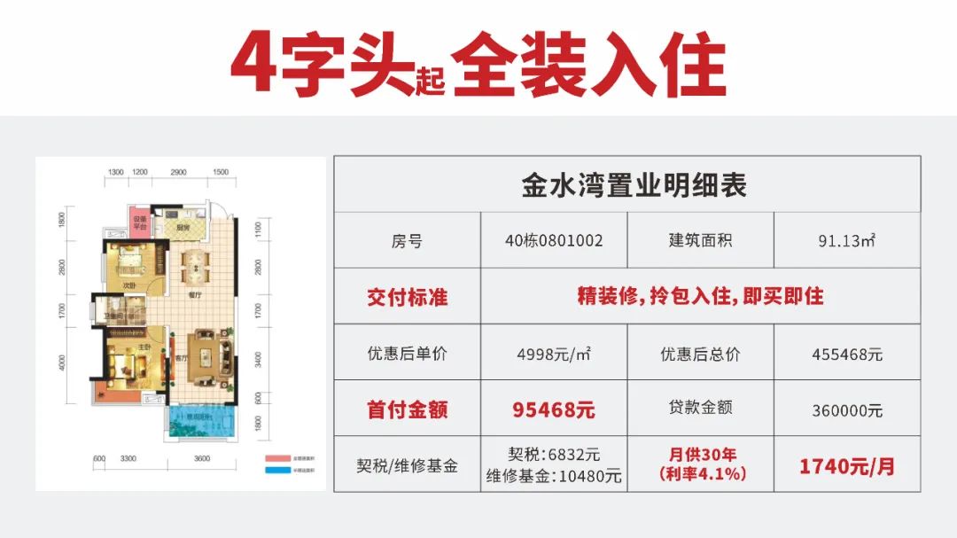 裝修、購置家電家居由金水灣統一規劃,一步到位,減少了很多中間環節,減少了投入。精裝成本可算入總房價按揭,無需額外支付高額裝修費用、家電家居費用,減輕您的財務壓力。