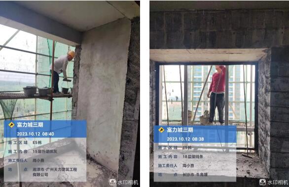 鋁窗13-12塞縫完成,18-20層一遍膩子完成,19-20層線條完成,1-屋面電梯井架子垃圾清理完成。