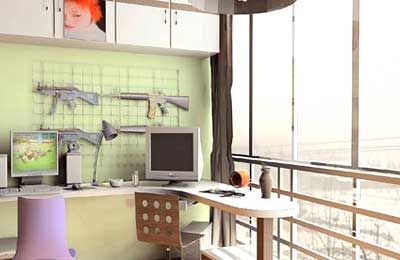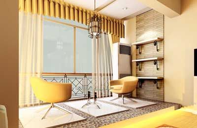 對于兩居室的住房來說,想要書房只能靠陽臺來布置了。在陽臺墻面立一整體書柜,下部設計成寫字桌面,頂部懸一伸縮式吊燈,在另一側設茶幾坐椅或逍遙椅,既可在此與友人敘談,書寫自己的人生,同時疲乏時還可放松心情。由于陽臺的溫度普遍比室內高,所以應該注意陽臺的通風及溫度的調節,以免夏季持續的高溫造成書房家具的變形與干裂。