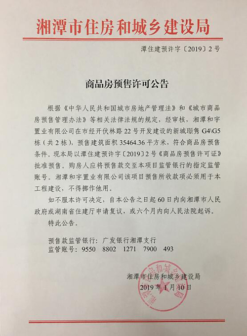經審核,湘潭和宇置業有限公司在市經開區伏林路22號開發建設的新城璟雋G4/G5棟(共2棟),預售建筑面積35464.36平方米,符合商品房預售條件。現湘潭市住建局以潭住建預許字【2019】2號《商品房預售許可證》批準預售。