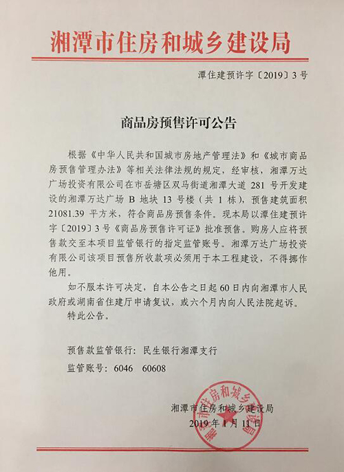 經審核,湘潭萬達廣場投資有限公司在市岳塘區雙馬街道湘潭大道281號開發建設的湘潭萬達廣場B地塊13號棟(共1棟),預售建筑面積21081.39平方米,符合商品房預售條件。現湘潭市住建局以潭住建預許字【2019】3號《商品房預售許可證》批準預售。 |