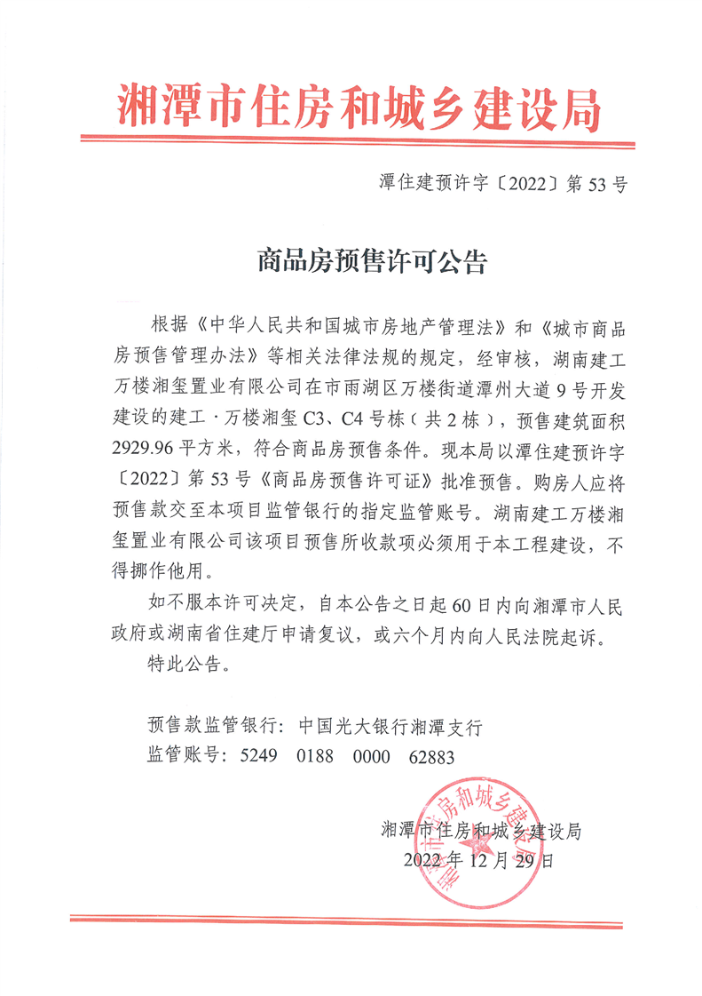 經審核,湖南建工萬樓湘璽置業有限公司在市雨湖區萬樓街道潭州大道9號開發建設的建工·萬樓湘璽 C3、C4號棟(共2棟),預售建筑面積2929.96 平方米,符合商品房預售條件。現本局以潭住建預許字〔2022〕第 53 號《商品房預售許可證》批準預售。