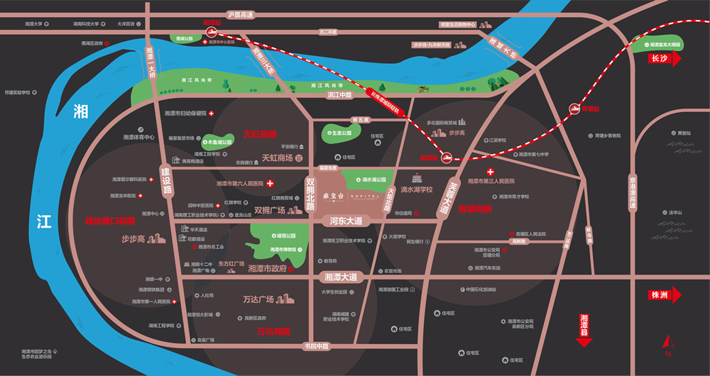 項目南鄰市區主干道河東大道,西鄰主干道雙擁大道,北靠城市綠肺滴水湖公園和湘江,周邊現已發展成熟,集商業、購物、學校、醫療、交通于一體,東臨城市輕軌站直抵長沙市區。